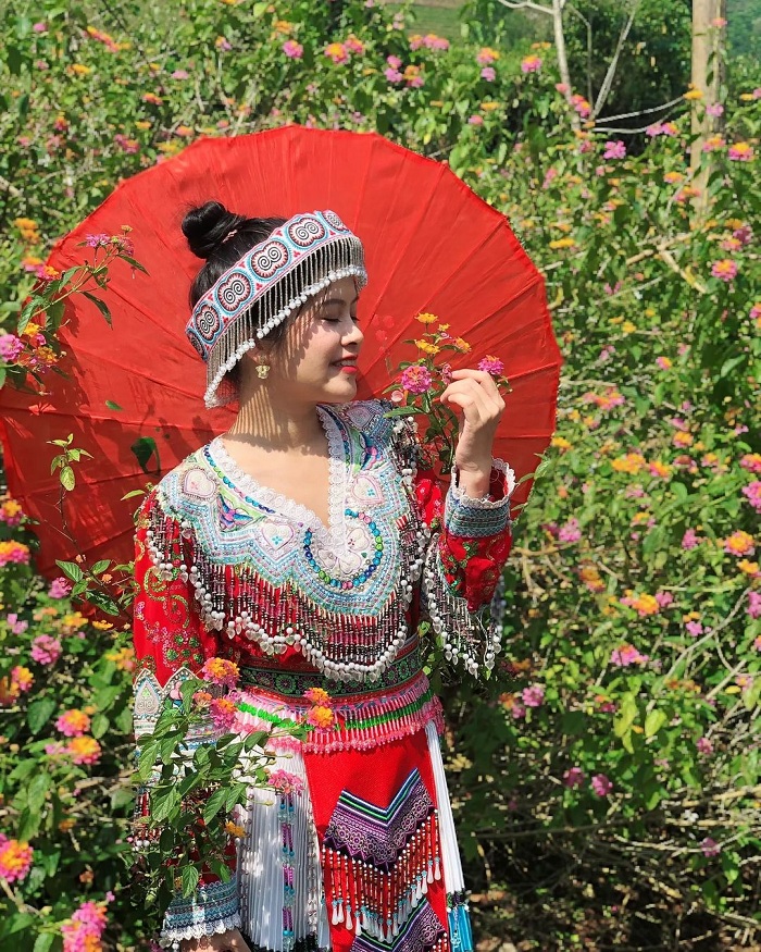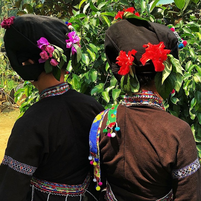 The Lu ethnic customs are famous for their colorful clothing, which are all handmade by the Lu women with very sophisticated and unique patterns. The women here wear indigo-colored clothes and split-chest dresses with the left flap on top of the right, decorated with colorful tassels. Lu's favorite necklaces and bracelets are made from silver, aluminum, and copper. In addition, Via bracelets, which are made from indigo threads, are usually worn to avoid evil spirits and bad luck. They also wear earrings that are shaped like tubes with threads to hang colorful cotton buds. The Lu women also wear headscarves that are rolled up and tilted to the left to reveal beautiful embroidered patterns.