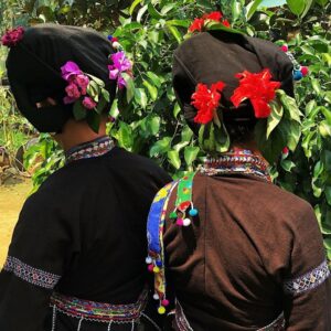 The men’s clothing is simpler with dark indigo clothes, which are split blouses with fabric straps, two pockets on the front, and one pocket on the left chest. The shoulder bag is a very valuable item, both aesthetically and in terms of traditional value for Lu’s men. These shoulder bags come in different sizes and are decorated with floral motifs and cotton buds in vibrant colors.